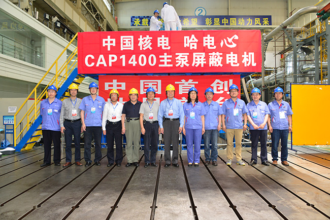 由哈电动装公司自主设计研发的世界首台国家重大专项示范工程CAP1400主泵屏蔽电机样机,目前已完成整机总装并开展出厂试验,王炳华董事长等领导在现场见证了主泵电机的启动及升速试验。试验开始后样机运转平稳,各项性能指标均完全满足设计要求。