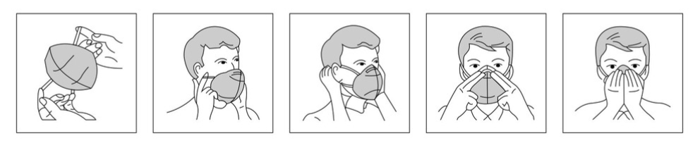 佩戴前洗手,将口罩颜色深的向外,浅色向内,鼻夹金属条在上,戴好后捏鼻夹塑型。